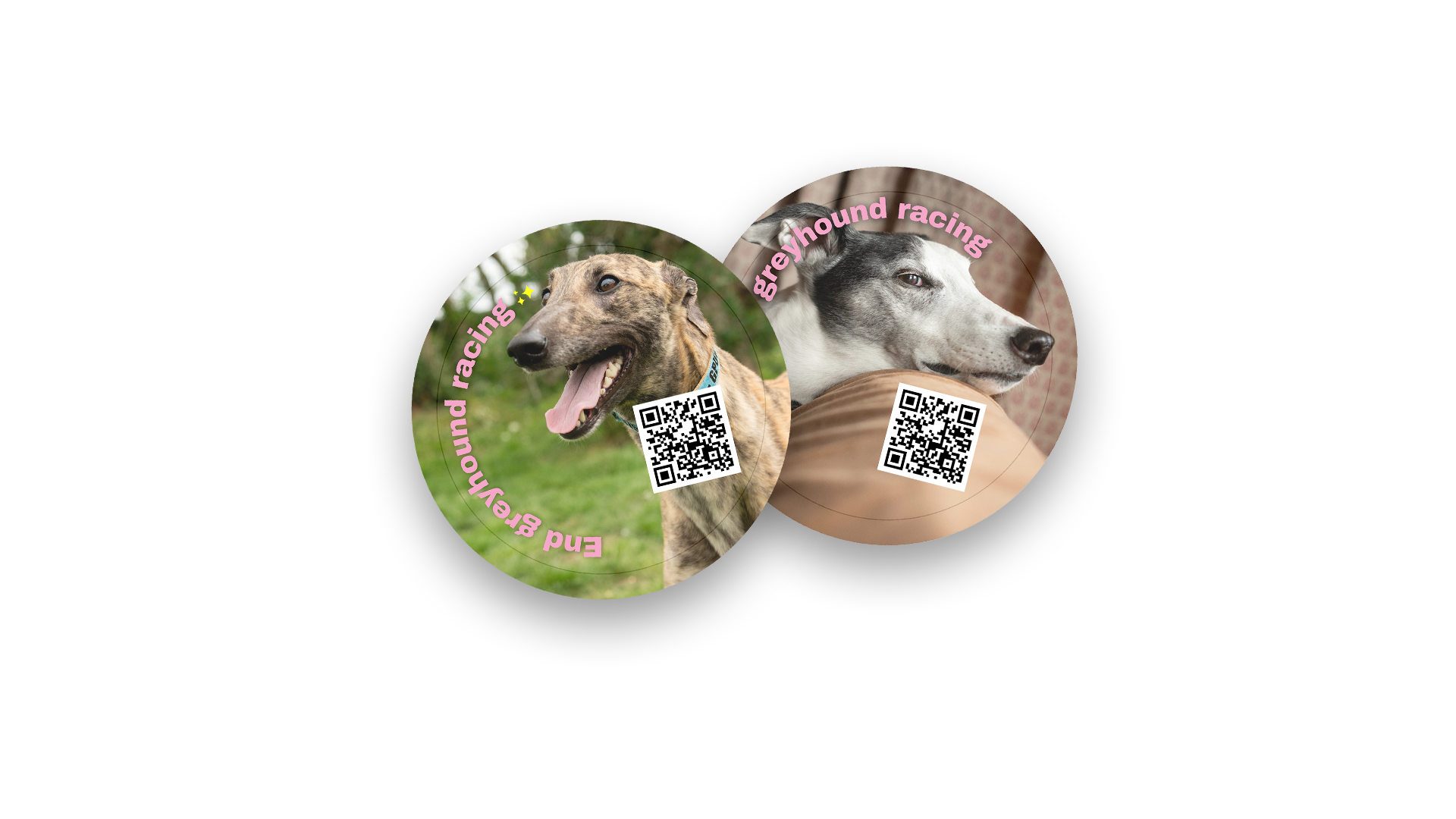 Stickers feature gorgeous rescued greyhounds and a QR code directing people to our government petition to End Greyhound Racing. Please sticker responsibly!