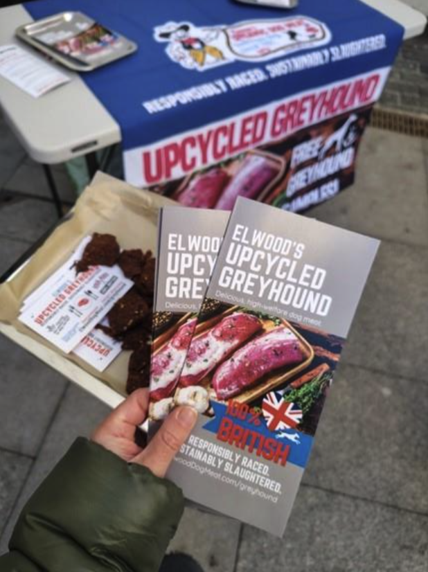 Not really! But that got your attention didn’t it? And it certainly got the attention of residents of Harlow, Oxford, Northampton, Bletchley, and Milton Keynes when they saw our collaboration with Elwood’s Organic Dog Meat. Elwood’s is a campaign group that specialises in a stunt where they pretend to be marketing meat from farmed dogs to encourage the public to question their own attitudes towards what, or who, is on their plate. This bespoke partnership saw outreach marketing the farm’s latest product: upcycled greyhound. The question this raises is: if you’re outraged at dogs being killed for food, will you stand against dogs being killed for racing?Â