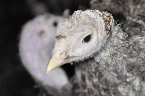 After 28 days in industrial incubators, turkey ‘poults’ are hatched and transported to large, purpose-built sheds where up to 25,000 turkeys can be housed together.