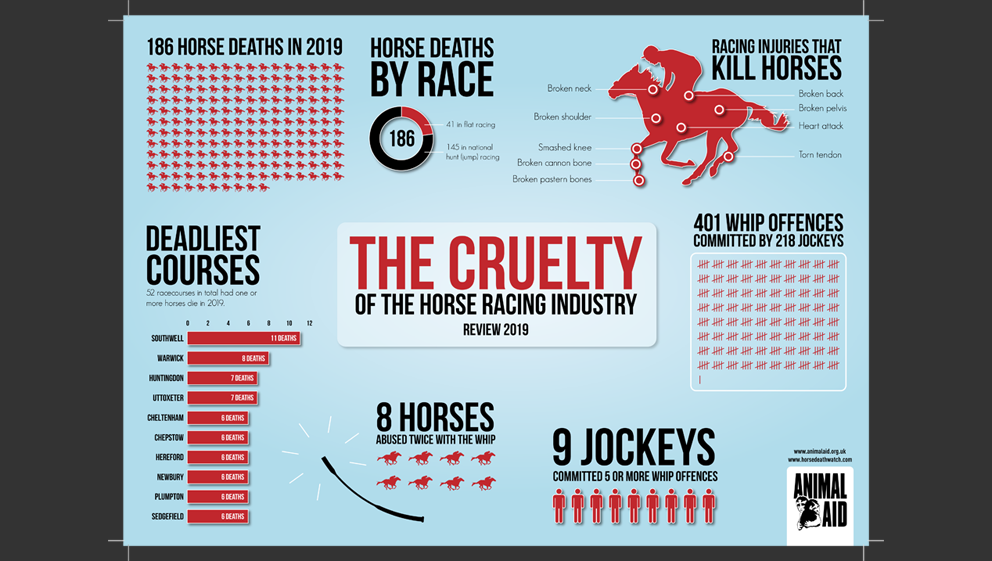 Animal Aid’s detailed research into race horse deaths found that 186 horses died in 2019 as a direct result of racing. This alarming figure shows no sign of improvement in comparison to the fatality records over recent years.