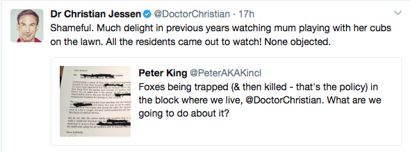 Kinleigh Folkard & Hayward had alerted residents in the block that a ‘pest’ controller would be setting up traps to ‘trap and remove’ the foxes – despite the letter not specifying any issues that foxes had been causing local residents. Following this, concerned residents took to social media to express their disgust and horror at the thought of the foxes being culled. Whilst the term ‘remove’ is used in the letter, it is illegal to trap wild animals and move them to other locations – therefore the animals would have been shot.