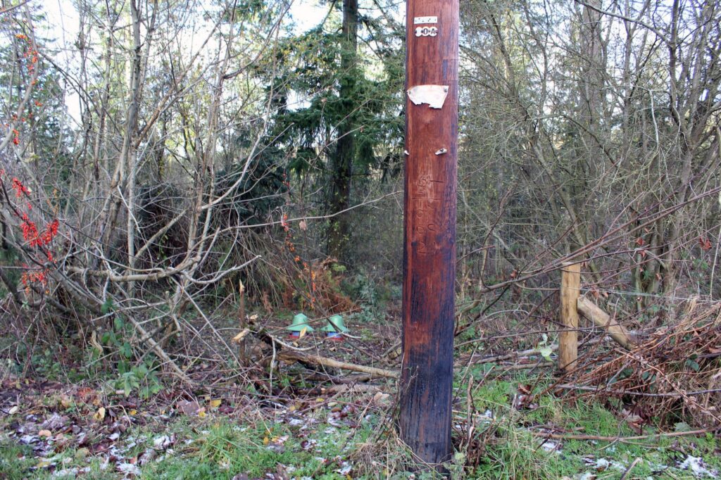 The feed is in the two green-capped units behind the road pylon and the road is in the foreground, immediately in front of the pylon.