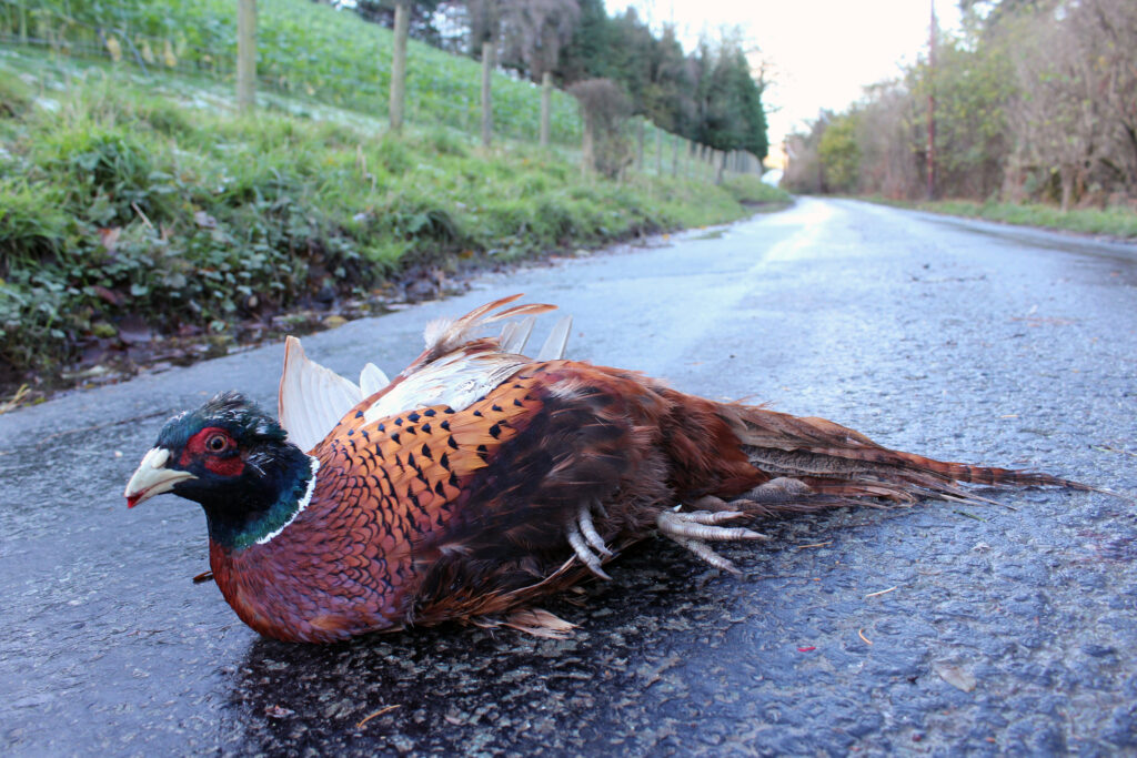 The birds associate the road with food. They have yet to learn how dangerous traffic is. This female pheasant found out too late.