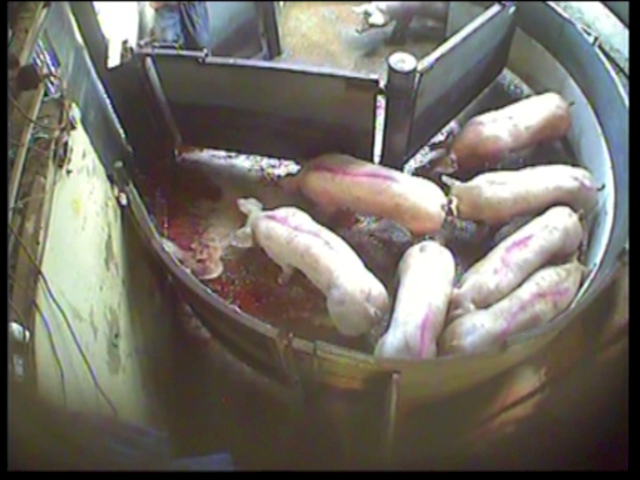 An additional worrying episode showed an apparently dead pig being dragged into the stun pen by a pole in her mouth. She was not stunned but she was shackled, hoisted and had her throat cut on the slaughter line. How this animal died, what she had been suffering from and where her meat ended up remain unknown.