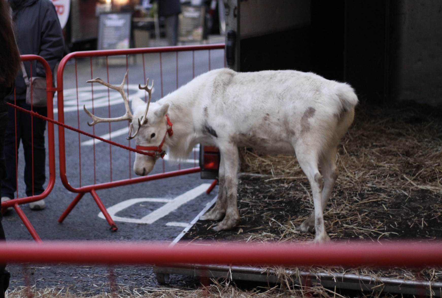 On Friday 28th November, Animal Aid investigators attended the Wincanton Christmas Light Switch On to observe and record the treatment of reindeer on display there. What they witnessed was disgraceful. Two juvenile reindeer were displayed in a tiny enclosure for hours. They displayed signs of agitation and distress throughout the event, repeatedly attempting to retreat into their small transportation vehicle to escape the noise, activity, and constant crowd attention. Young children were seen pulling the reindeersâ antlers and grabbing at their ears. The only response from the handlers was a brief, âItâs not a toyâ. If you present animals as though they are objects, children will often treat them as such â it’s our job to provide a much better example for young people by not using live animals as props.
