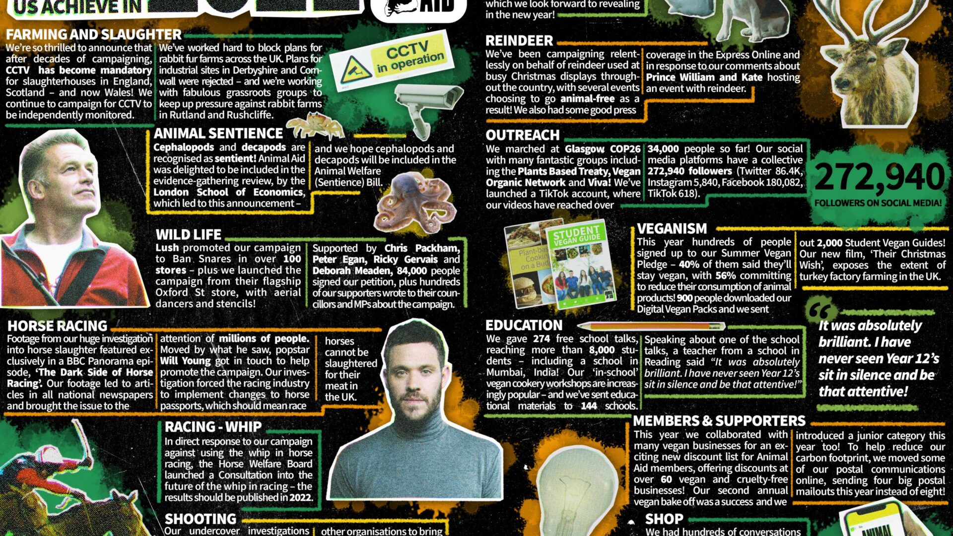 From supporting schools and teachers by providing free school talks and teaching materials, to launching our new anti-snaring campaign, blocking plans for rabbit fur farms, having our undercover footage featured in a prime-time BBC1 documentary, getting extensive press coverage on the use of animals in Christmas displays, and providing amazing vegan goods via our online shop, 2021 was a truly successful year.