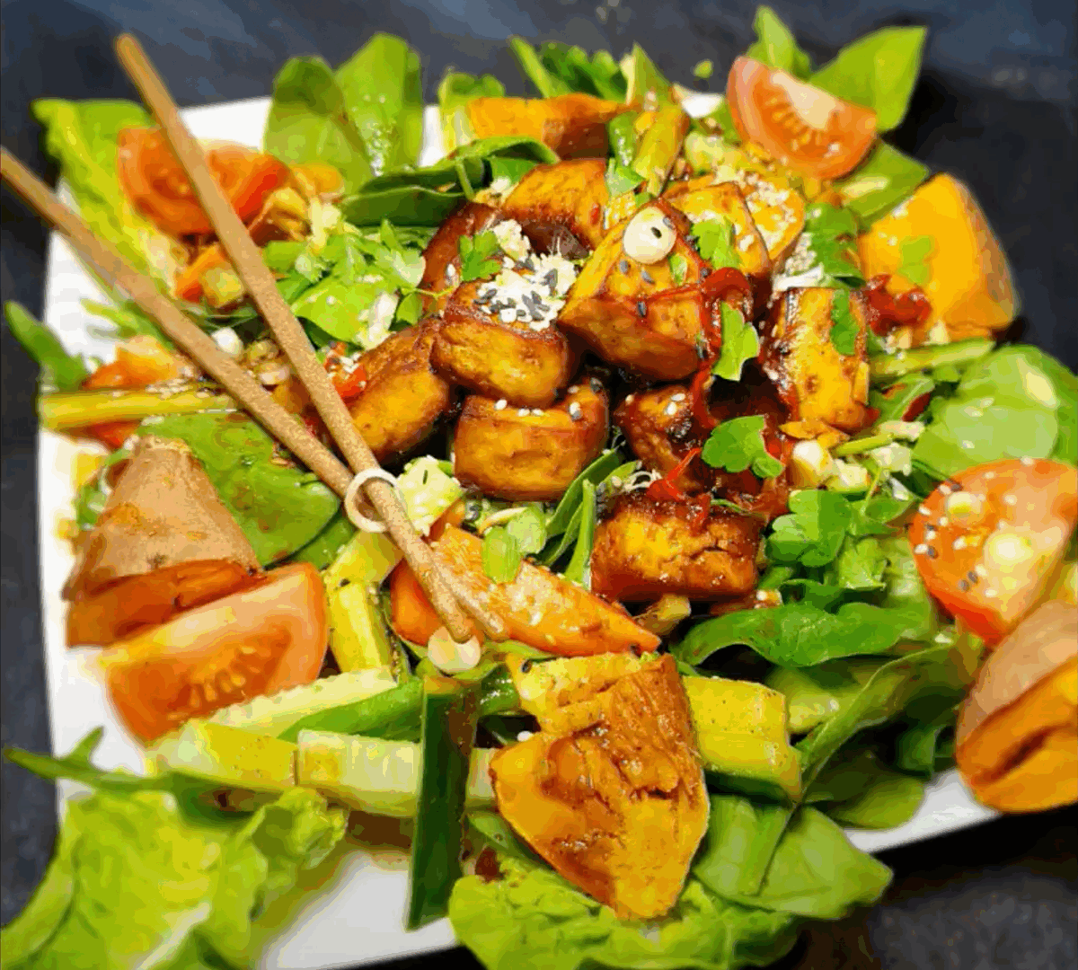 6) Add the hot tofu to the salad and the potato, pour over the remaining marinade. Serve straight away. Enjoy!