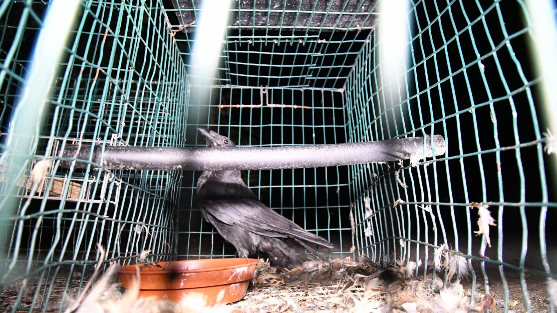 Animal Aid’s new film uses a speeded-up timer to demonstrate the amount of time the crows are left in the Larsen trap. It is not known how long they had already been in the trap, nor how much longer they were confined. What is clear, however, is that the birds were stressed, and desperate to be released.